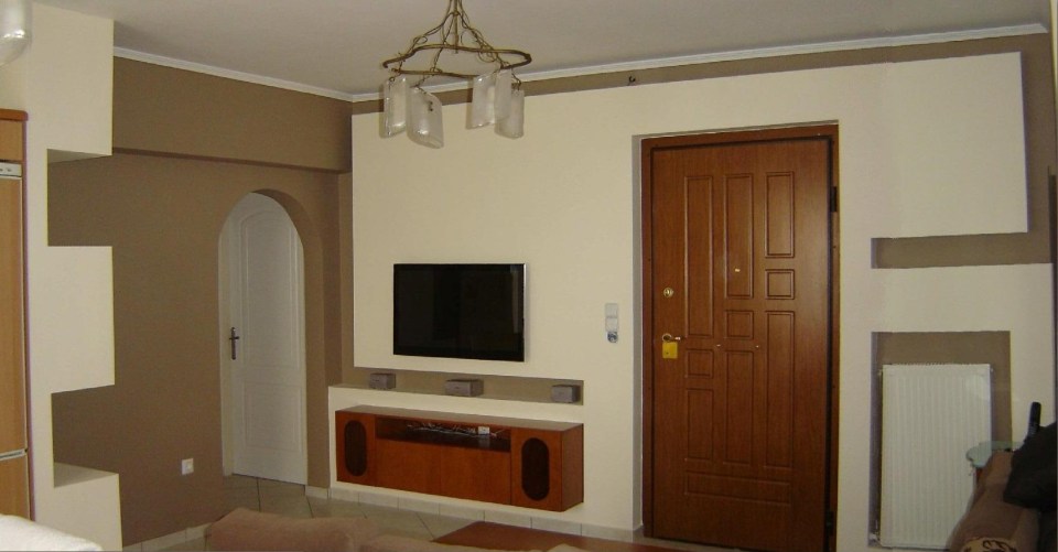 ΑΝΑΚΑΙΝΙΣΗ ΔΙΑΜΕΡΙΣΜΑΤΟΣ ΣΤΗ ΝΙΚΑΙΑ: Μελέτη δύο εσωτερικών όψεων χώρου καθιστικού, σχεδιασμός επίπλου tv και κατασκευών από γυψοσανίδα με κρυφούς φωτισμούς, χρωματική μελέτη