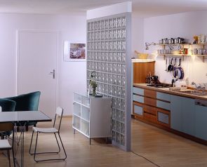 Μια καλή λύση για να απομονώσουμε οπτικά την κουζίνα από την είσοδο του σπιτιού μας, είναι η παρεμβολή τοιχώματος από ημιδιάφανο υλικό (όπως είναι το υαλότουβλο), λύση η οποία παρέχει την απαραίτητη οπτική απομόνωση στην κουζίνα μας, αφήνοντας το φως να διαχυθεί από και προς τους υπόλοιπους χώρους.