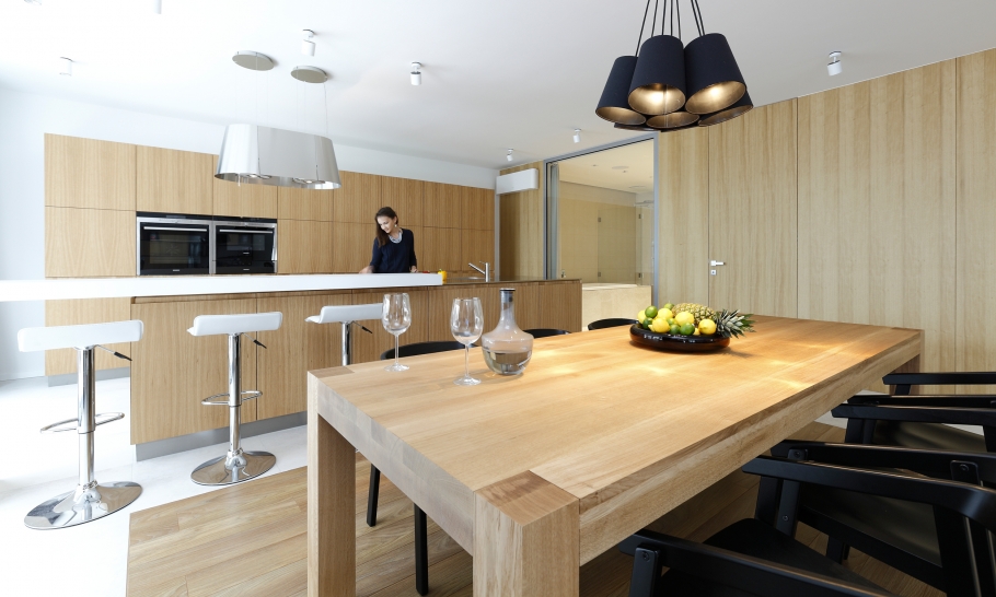 Καλό είναι στην ανοικτή κουζίνα τα υλικά, το χρώμα, οι υφές, αλλά και οι μορφές σχεδιασμού να ανταποκρίνονται και να δένουν με την αισθητική του υπόλοιπου σπιτιού, ώστε να προκύπτει ένα σύνολο ενιαίο και αρμονικό. Στο ακόλουθο παράδειγμα, η χρήση του ίδιου χρώματος ξύλου στην κουζίνα και στα εσωτερικά διαχωριστικά τοιχώματα του σπιτιού, ενοποιεί οπτικά την κουζίνα με τους υπόλοιπους χώρους, δίνοντας ένα ενιαίο σύνολο.