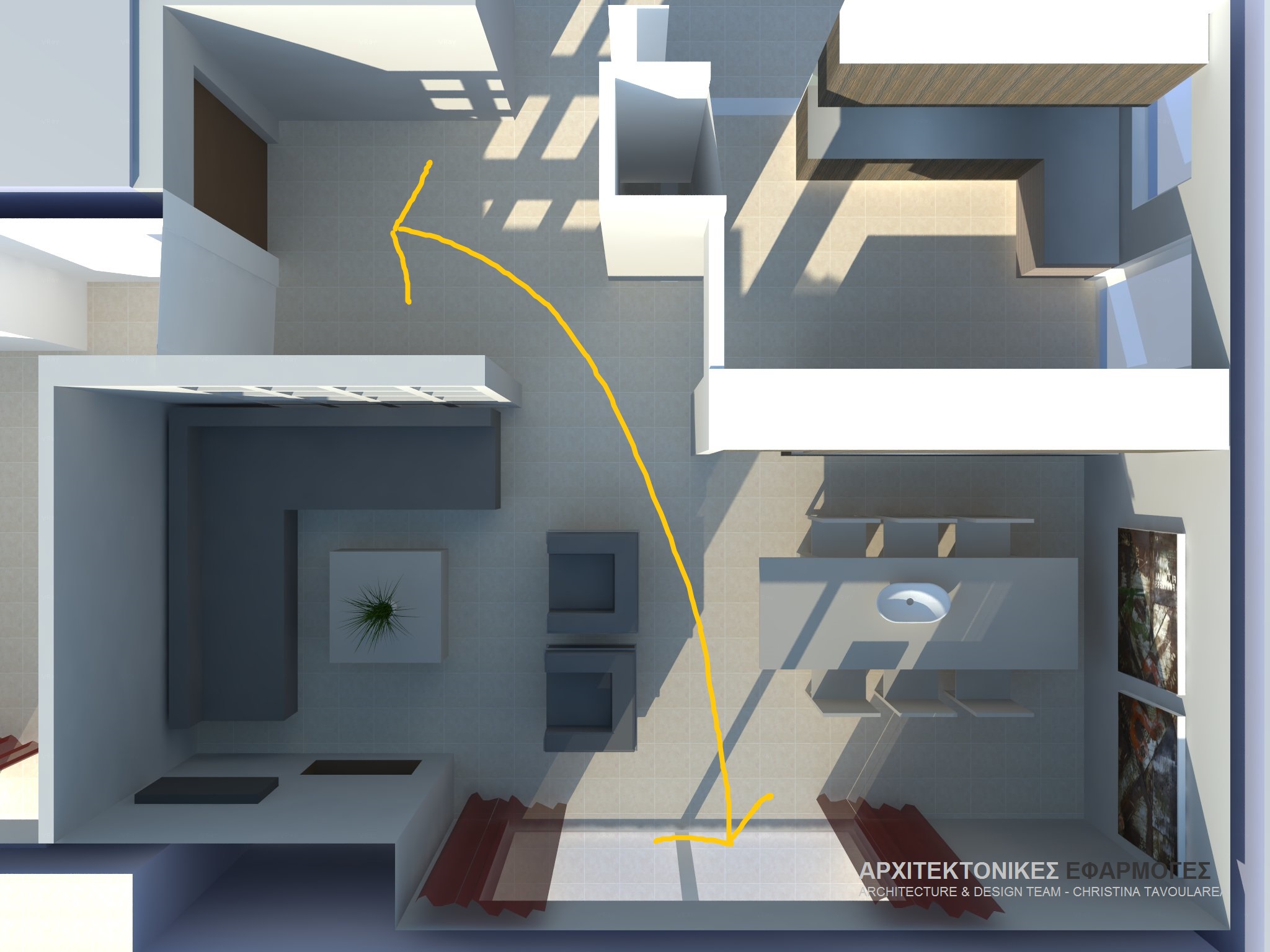 (2014) Αναδιαρρύθμιση Διαμερίσματος Στην Αγία Παρασκευή: Ο χώρος κίνησης μεταξύ εισόδου και μπαλκονόπορτας αφήνεται ελεύθερος.
